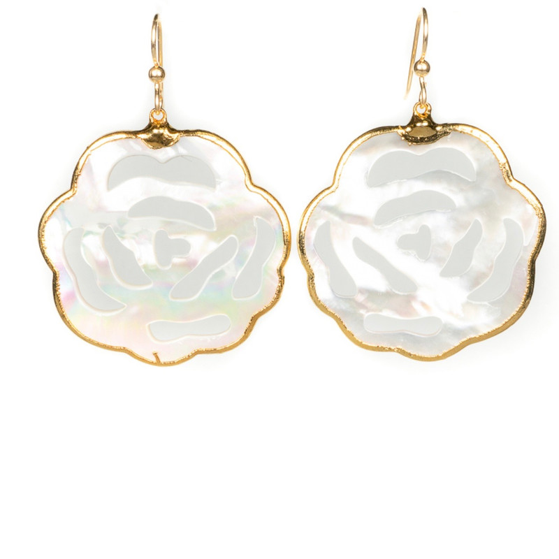 Description Large mother of pearl flower 14 karat gold filled wire 1.75 inch drop Made in USA Additional Details SKU: E-FL UPC: