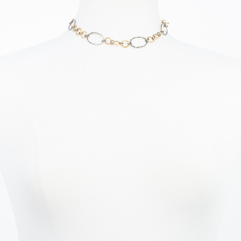 Description Oxidized sterling and 18 karat over sterling link choker 14 karat gold filled toggles 16 1/2 inches Additional Details SKU: CH-OXS UPC: